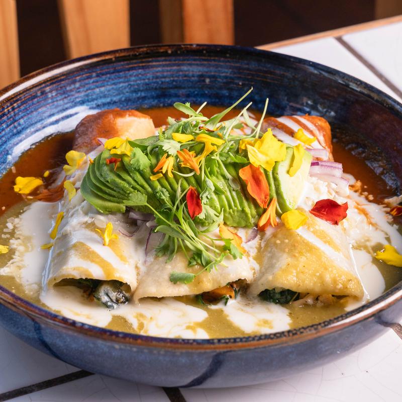 Tortillas hand-rolled with choice of +pollo, carnitas, or veggies, salsa roja & verde, fresh onion, cheese, crema, avocado, herbs | Dairy