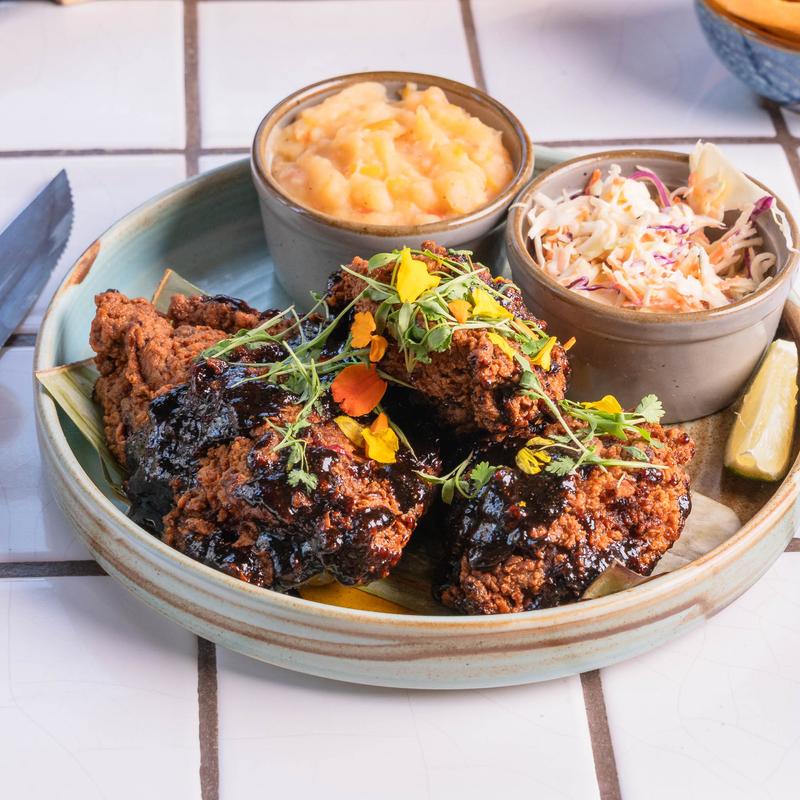 Bone-in +chicken, buttermilk-spice brine, sweet-savory salsa macha paired with Mexi-mash potatoes, chingona coleslaw | Dairy, nuts
